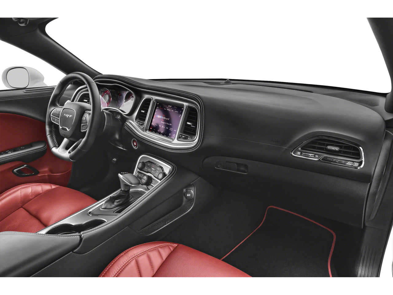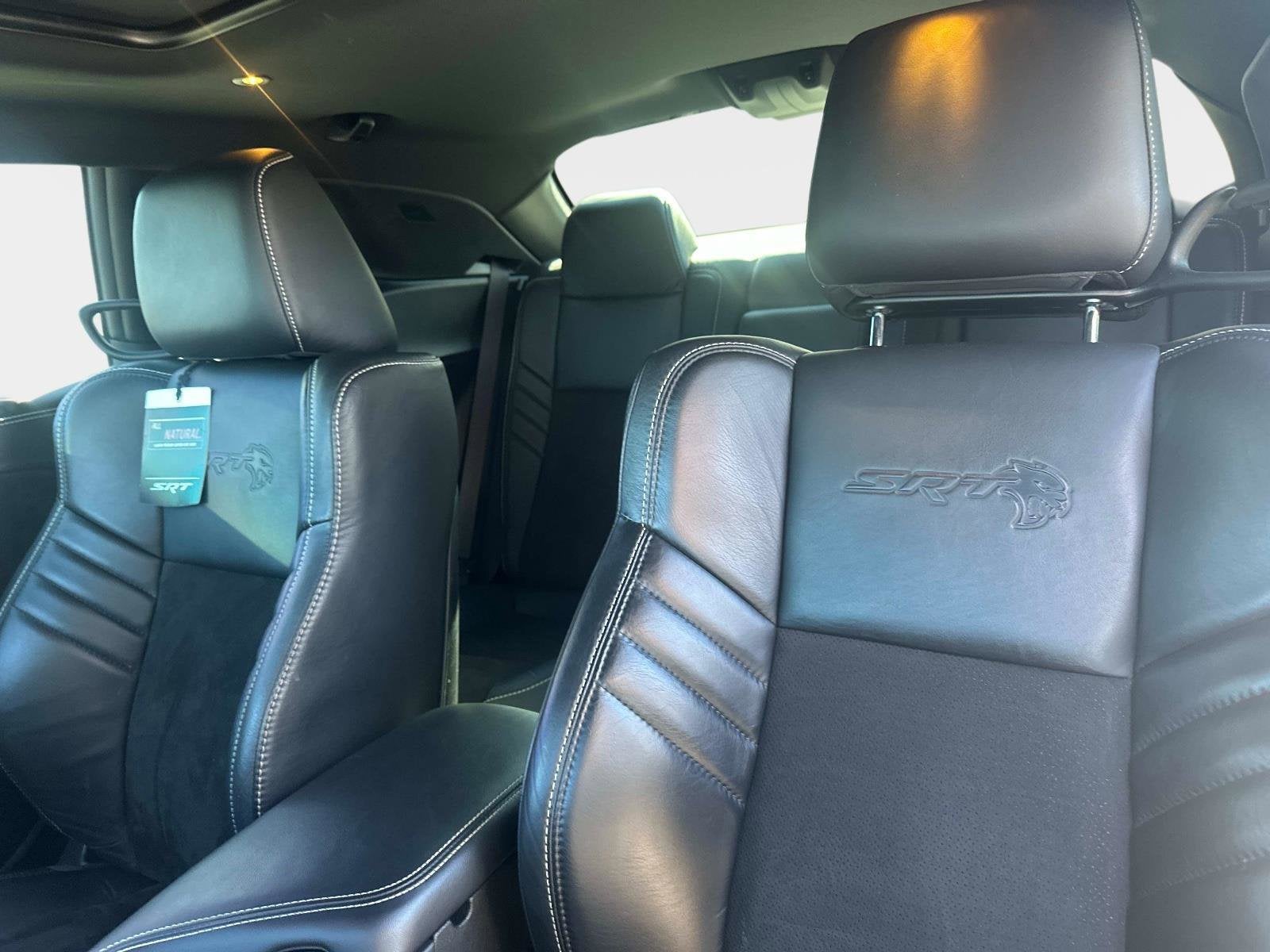 Inside, the cabin blends performance and luxury with ventilated and heated front seats, a heated SRT leather steering wheel with red LED logo, premium-stitched dash, suede door panels, memory seating, and a power tilt/telescope steering column. Technology and convenience are elevated with Uconnect 4C and an 8.4-inch touchscreen, SRT Performance Pages, a 200-mph speedometer, blind-spot monitoring, adaptive cruise control, forward collision warning, rain-sensing wipers, and a Harman Kardon 18-speaker premium audio system. Exterior upgrades include a power sunroof, SRT performance spoiler, black brake calipers, and Midnight Metallic badging that complete its menacing presence.